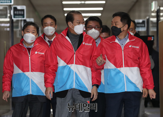 권영세 국민의힘 선거대책본부장과 김기현 원내대표 등이 3일 오전 국회에서 열린 선거대책본부-원내지도부 연석회의에 참석하고 있다. (사진=공동취재단)