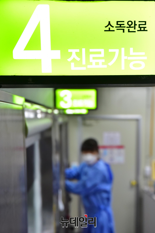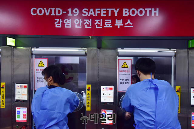 코로나19 검사 체계가 전면 개편된 3일 오후 서울 관악구 양지병원에 마련된 감염안전진료부스에서 의료진들이 신속항원 검사 업무를 하고 있다.