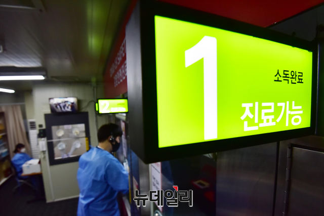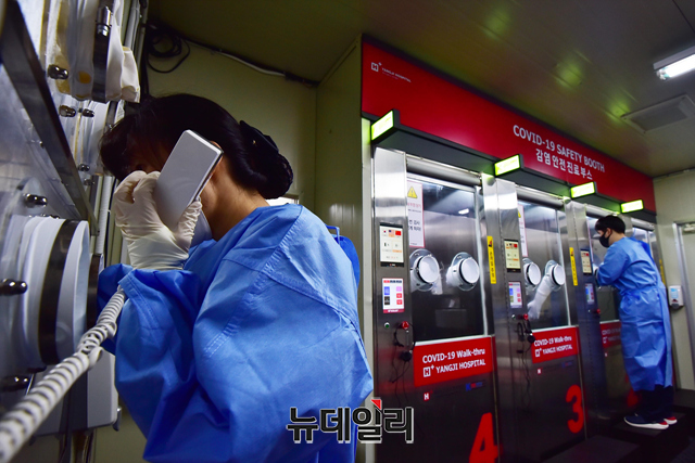 코로나19 검사 체계가 전면 개편된 3일 오후 서울 관악구 양지병원에 마련된 감염안전진료부스에서 의료진들이 신속항원 검사 업무를 하고 있다.