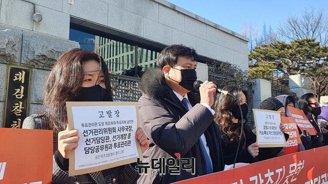 자유대한호국단과 미래를여는청년변호사모임 등이 3일 오후 서울 서초구 대검찰청에서 선거관리위원회 공무원들과 투표관리관을 고발하는 기자회견을 갖고 있다.이들은 기자회견문을 통해 "4.15 부정선거 논란으로 그 어느 때보다 국민들의 선거관리위원회에 대한 불신이 크며, 제20대 대선에서 선관위의 선거 중립성이 요구되고 있다"며 "선거를 관리해야할 선거관리위원회가 오히려 투표관리관 사인을 위조하고, 공직선거법상 가능하지도 않은 사람들을 감시의 사각지대에 놓여 있는 거소투표를 하게 하고, 투표시간을 넘겨 임시투표소에서 투표를 가능하게 하여 무효표 논란, 부정선거 논란을 부추기는 명백히 잘못된 일이다"고 밝혔다. (사진=자유대한호국단)