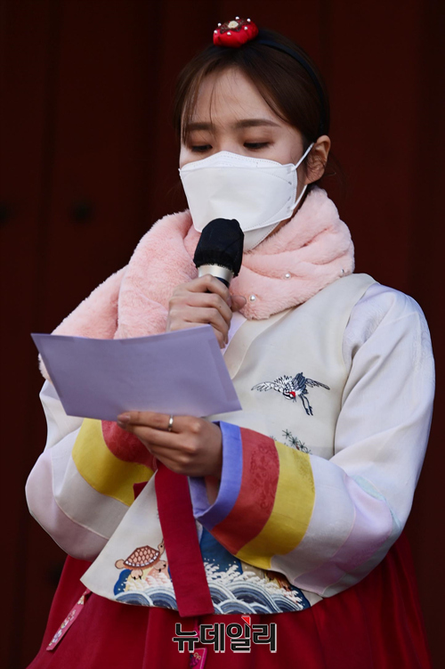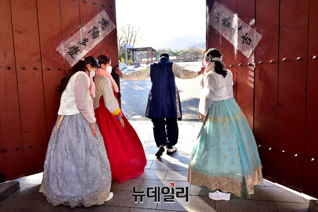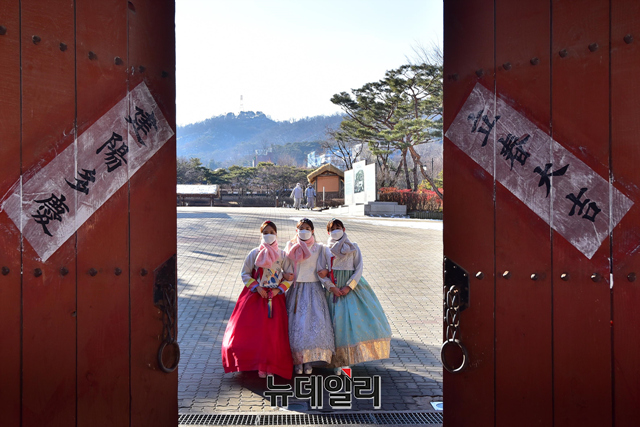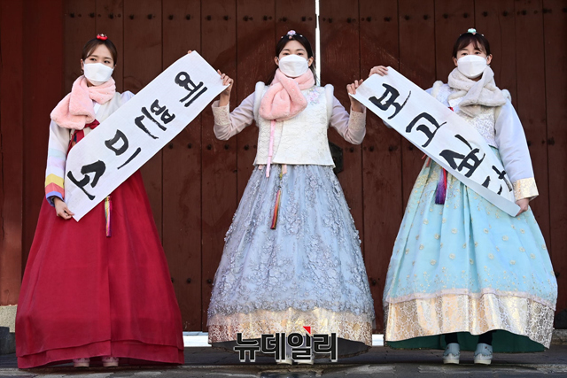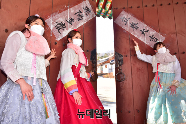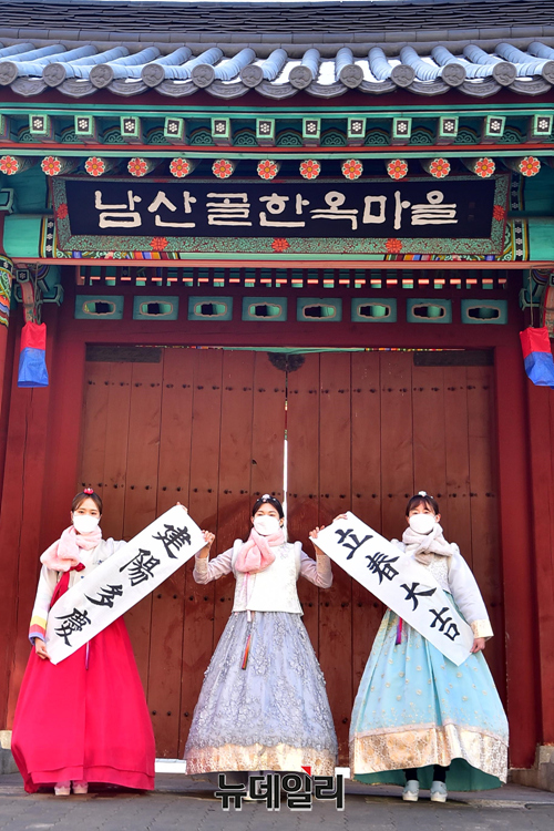 24절기 중 첫 번째 절기상 입춘인 4일 오전 서울 중구 남산골한옥마을에서 열린 입춘첩 부착 시연 행사에서 김윤지 건국대 간호통합서비스병동 간호사, 강민영 코로나 격리 해지 중환자실 간호사, 안영민 구로소방서 소방행정과 안전담당 소방장(왼쪽부터)이 '입춘대길 건양다경' 문구가 적힌 입춘첩을 들고 포즈를 취하고 있다.이들은 "코로나19로부터 국민들의 건강과 안전을 지키기 위해 많은 분들이 함께 고생하고 있다"며 "올해는 따뜻한 봄바람과 함께 모든 근심, 걱정 등 코로나와 함께 전부 날아가, 포근한 해가 찾아왔으면 좋겠다"고 말했다.'입춘대길 건양다경'은 봄이 시작되니 하는 일마다 크게 길하고 경사스러운 일만 있기를 바라는 뜻을 담고 있다.