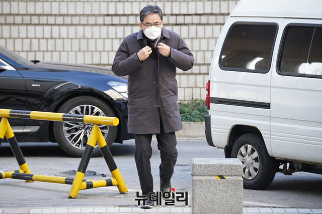 화천대유 측으로 아들의 거액의 퇴직금을 받아 논란이 된 곽상도 전 의원이 4일 오전 서울 서초구 서울중앙지법에서 열린 두번째 구속 전 피의자 심문(영장실질심사)에 출석하고 있다.