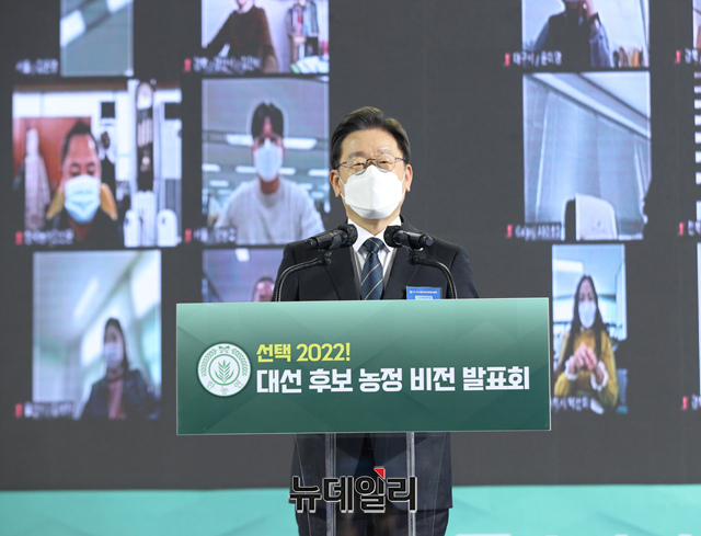이재명 더불어민주당 대선 후보가 4일 오후 서울 송파구 잠실학생체육관에서 열린 한국농업경영인중앙연합회 주최 '선택 2022! 대선 후보 농정 비전 발표회'에서 농정 비전을 발표하고 있다. (사진=이재명 캠프)