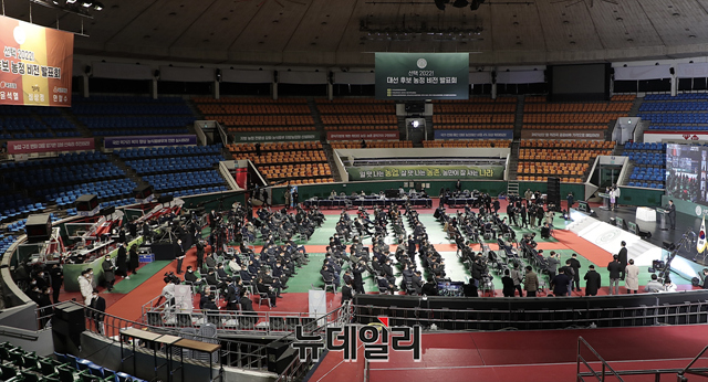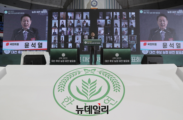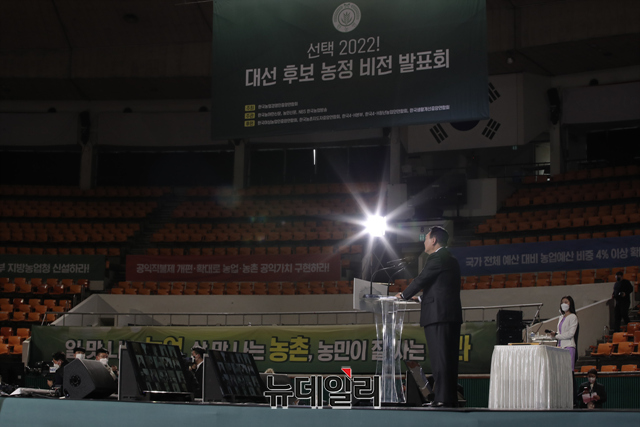 윤석열 국민의힘 대선후보가 4일 오후 서울 송파구 잠실종합운동장 학생체육관에서 진행된 '대선후보 농정 비전 발표회'에서 발언을 하고 있다.