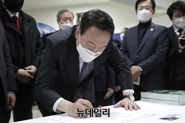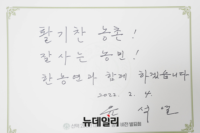 윤 후보는 "활기찬 농촌!, 잘사는 농민!, 한농연과 함께 하겠습니다"고 방명록을 남겼다. (사진=윤석열 캠프)