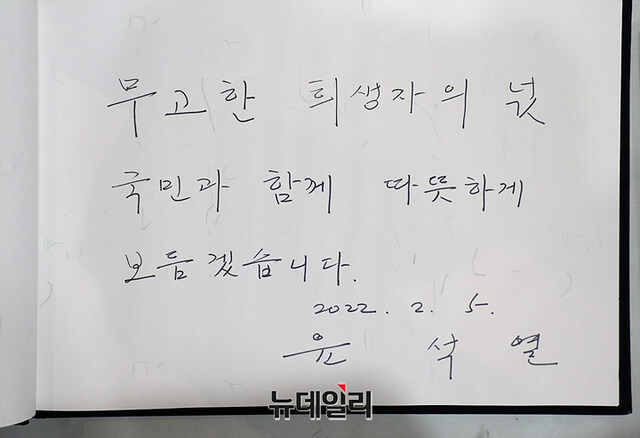 윤석열 국민의힘 대선후보가 5일 오후 제주시 제주4.3평화공원 내 위패봉안실에서 방명록을 작성하고 있다. (사진=윤석열 캠프)