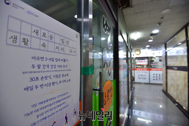 서울시가 지역 소상공인 50만 명에게 100만 원 씩 임대료 명목으로 지원하는 '소상공인 지킴자금' 신청 첫날인 7일 오전 서울 여의도에 위치한 식당가에서 종업원이 청소를 하고 있다.