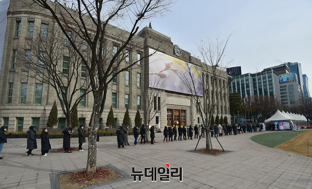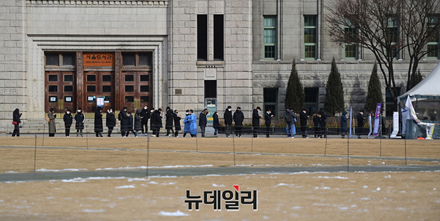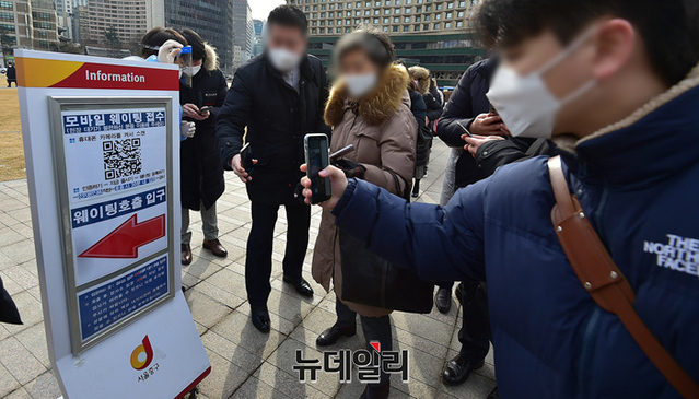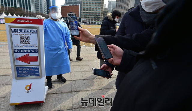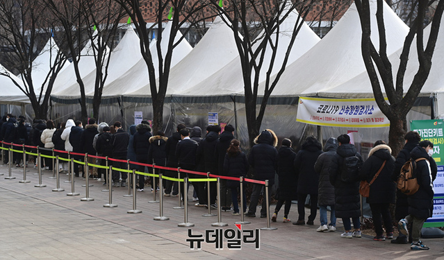 오미크론 확산세가 커지고 있는 7일 오전 서울 중구 서울광장에 마련된 임시선별진료소를 찾은 시민들이 검체검사를 받기 위해 줄을 서 있다. 검사소 측은 모바일 웨이팅 접수를 이용해 대기 시간을 줄이기 위해 노력하고 있다.