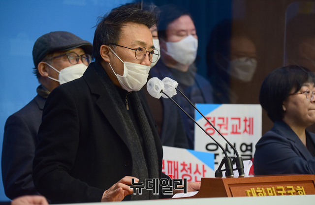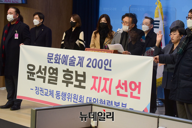 박현준 한국 오페라협회 회장 등 문화·예술계 인사 200인이 7일 오전 국회 소통관에서 윤석열 국민의힘 대선 후보 지지를 선언을 하고 있다.
