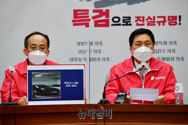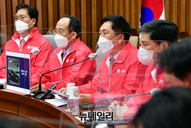 김기현 국민의힘 원내대표가 8일 오전 국회에서 열린 원내대책회의에서 이재명 대선후보의 관용차 사적 사용 의혹과 관련 발언을 하고 있다. (사진=공동취재단)