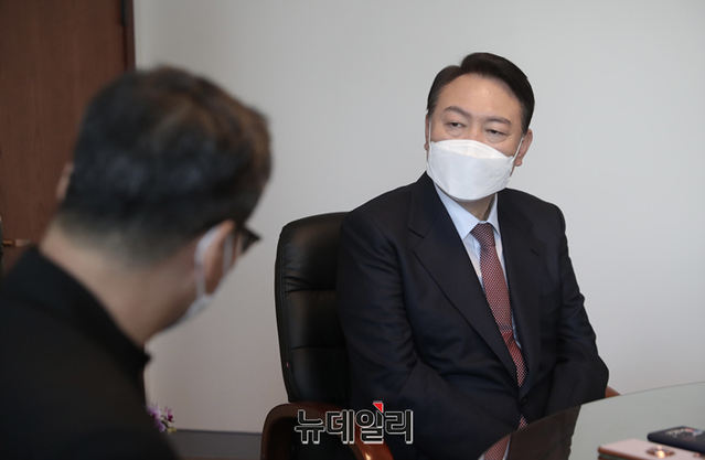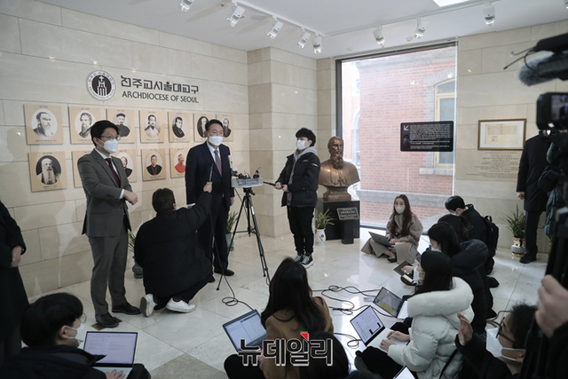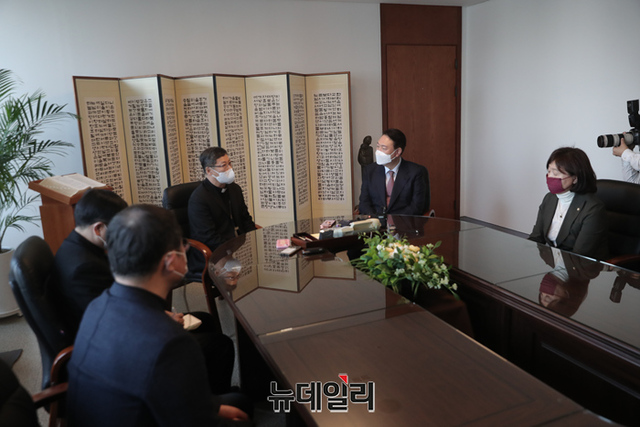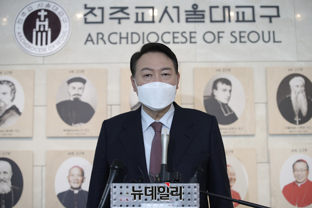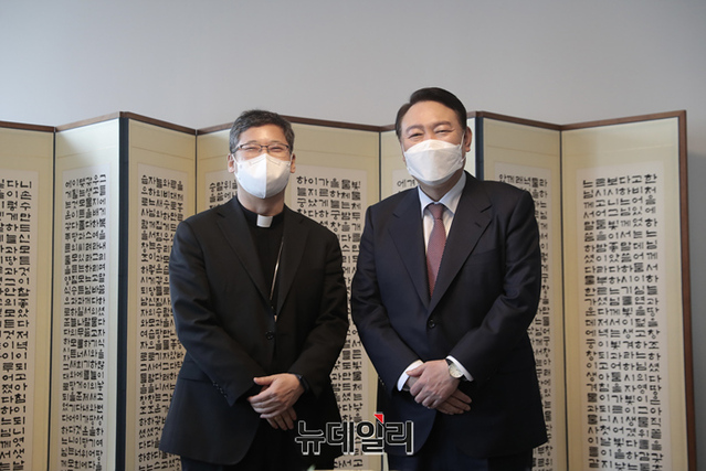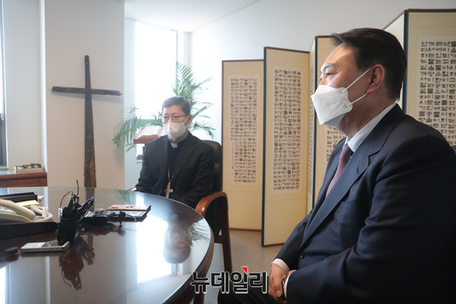 윤석열 국민의힘 대선후보가 9일 오전 서울 중구 천주교 서울대교구청에서 정순택 대주교(천주교 서울대교구장)를 예방하고 있다. (사진=윤석열 캠프)