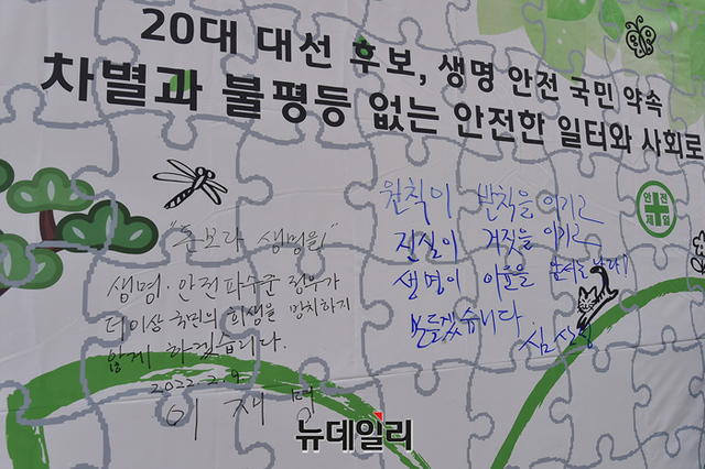 이재명 더불어민주당 대선후보가 9일 오전 서울 중구 서울시의회 앞에 마련된 세월호 추모공간에서 열린 생명안전 국민약속식에 참석해 발언하고 있다. 이 후보는 "돈보다 생명을! 생명·안전 파수꾼 정부가 더 이상 국민의 희생을 방치하지 않게 하겠습니다"라고 글귀를 남겼다.