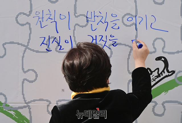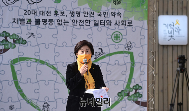 심상정 정의당 대선후보가 9일 오전 서울 중구 서울시의회 앞에 마련된 세월호 추모공간에서 열린 생명안전 국민약속식에 참석해 발언하고 있다.