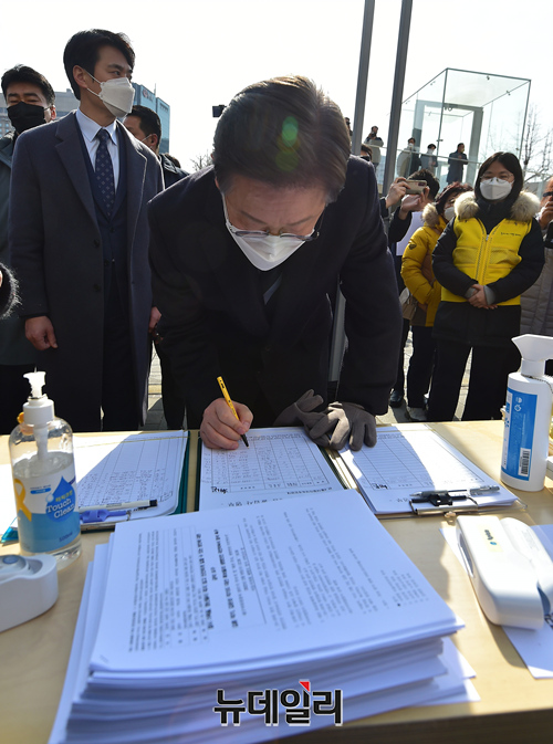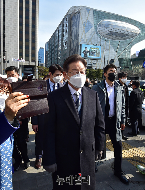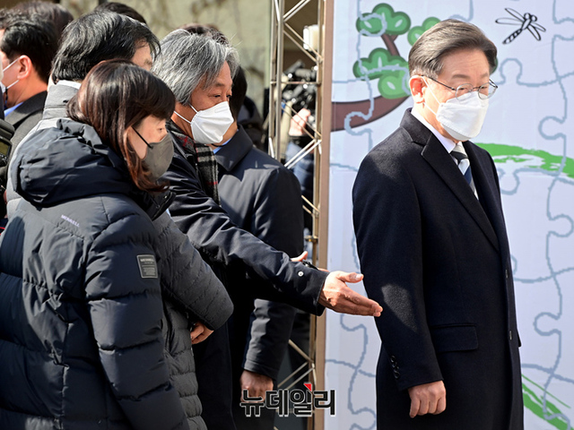 이재명 더불어민주당 대선후보가 9일 오전 서울 중구 서울시의회 앞에 마련된 세월호 추모공간에서 열린 생명안전 국민약속식에 입장하고 있다.