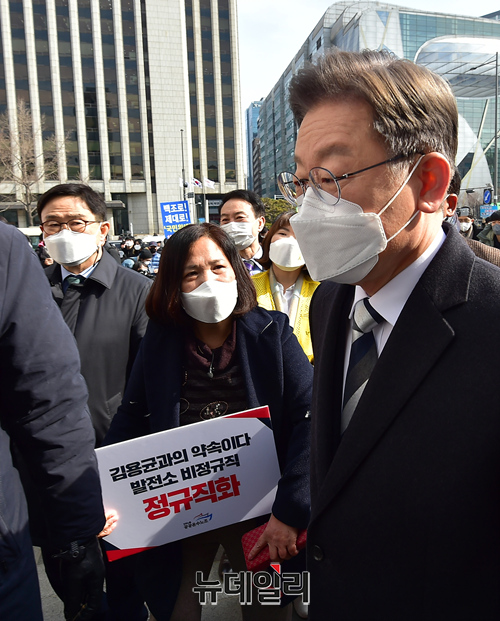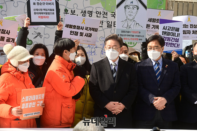 이재명 더불어민주당 대선후보가 9일 오전 서울 중구 서울시의회 앞에 마련된 세월호 추모공간에서 열린 생명안전 국민약속식에서 피해자 대표들의 발언을 듣고 있다.