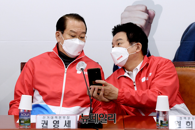 권영세 국민의힘 선거대책본부장이 원희룡 정책본부장과 10일 오전 국회에서 열린 선거대책본부-원내지도부 연석회의에서 대화를 나누고 있다. (사진=공동취재단)