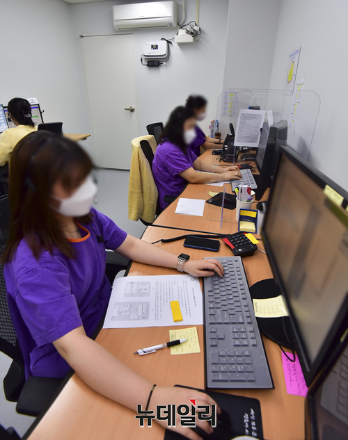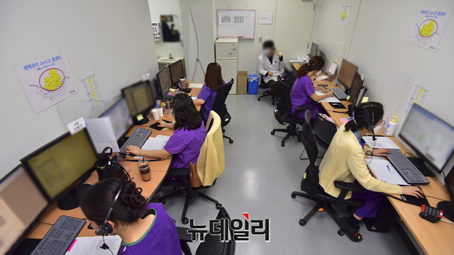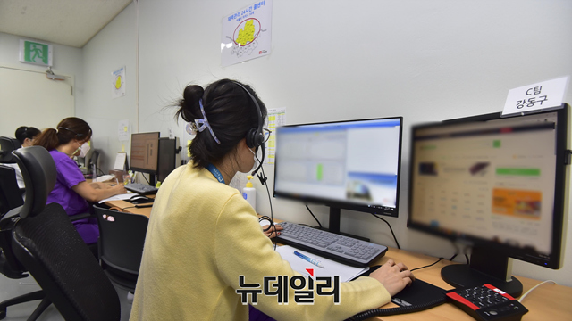 서울시가 동부병원과 서남병원에서 24시간 '재택치료 의료상담센터' 운영 체계를 가동한 10일 오후 서울 동대문구 동부병원 재택치료 의료상담센터에서 의료진들이 업무를 하고 있다.서울시는 2월 10일부터 재택치료 체계를 개편해 집중관리군 중심으로 모니터링을 시행하고, 일반관리군 관리는 동네 병·의원과 협력체계로 전환하겠다고 밝혔다.