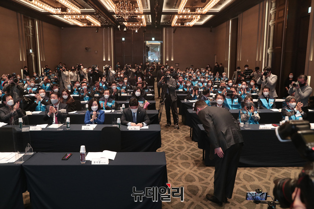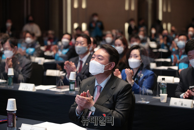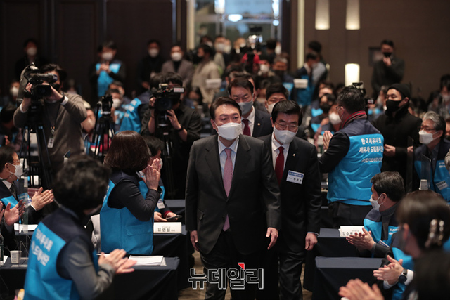 윤석열 국민의힘 대선후보가 10일 오후 서울 서초구 엘타워에서 열린 세무사 드림봉사단 발대식에 입장하고 있다. (사진=윤석열 캠프)