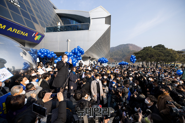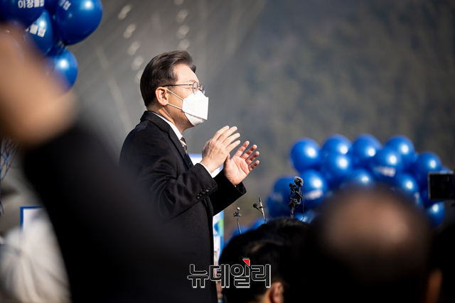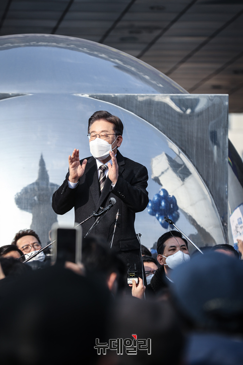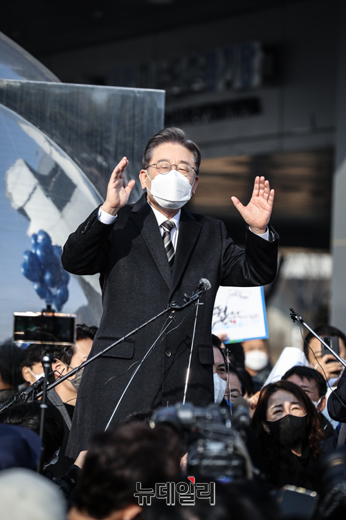 이재명 더불어민주당 대선 후보가 12일 오전 대전시 유성구 대전e스포츠경기장 앞에서 즉석연설을 하고 있다. (사진=이재명 캠프)