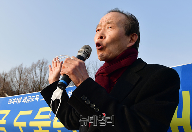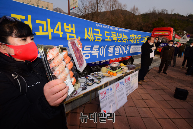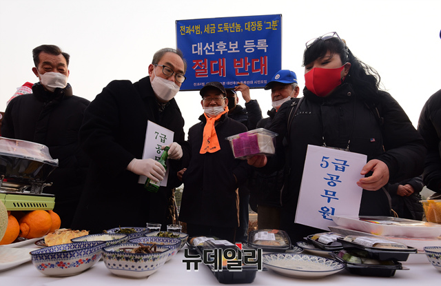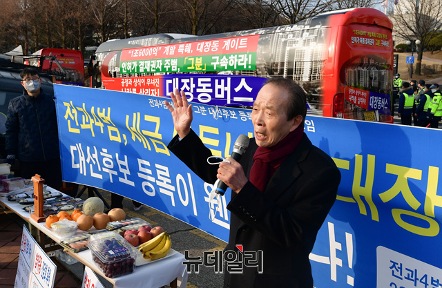 대장동게이트 '그분' 대선후보 등록 항의 집회가 13일 오전 과천 중앙선거관리위원회 앞서 열리고 있다.집회에는 대장동게이트진상규명범시민연대(대진범 상임공동대표 장기표, 이호승, 이민구) 대장동특검촉구천만인서명본부(상임공동대표 장기표)외에 더불어민주당정풍운동연대(상임대표 송명식) 깨어있는시민연대당(대표 이민구) 문재인을사랑하는모임(전국대표 김석준) 등이 참석했다.이날 참석자들은 대장동 특혜 등 각종 비리 연루 의혹을 받는 이재명 더불어민주당 후보의 후보등록을 반대한다고 밝히고 최근 문제가 되고 있는 법인카드 유용 논란 관련 퍼포먼스를 펼쳤다.