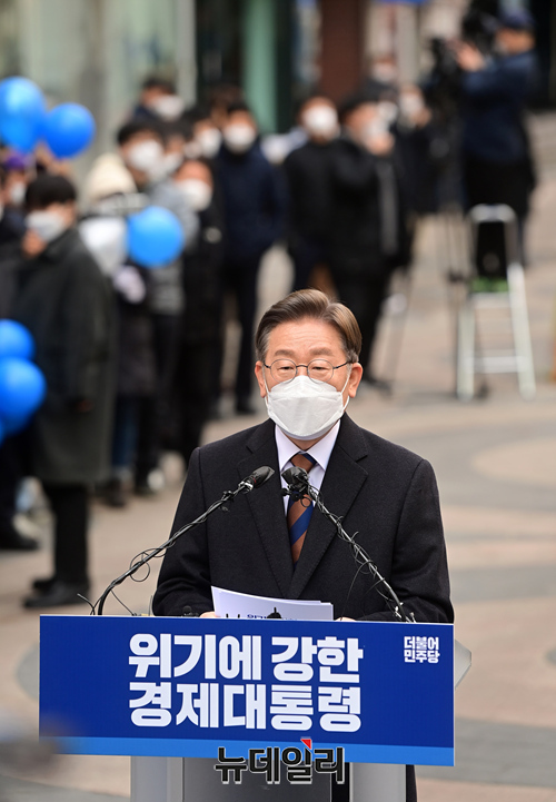 제20대 대통령 공식 선거운동을 하루 앞둔 14일 오전 서울 중구 명동거리에서 이재명 더불어민주당 대선후보가 국민통합 선언을 하고 있다.
