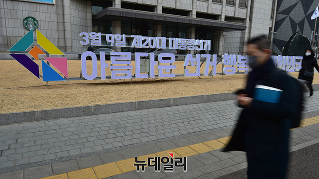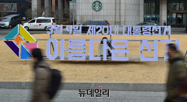 선거관리위원회가 제20대 대통령선거 공식 선거운동을 하루앞둔 14일 오전 서울 중구 한국프레스센터 앞에 홍보 조형물을 설치했다. 조형물은 '3월 9일 제20대 대통령선거, 아름다운 선거 행복한 대한민국' 문구가 적혔다.