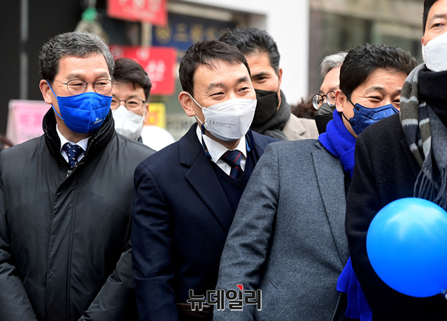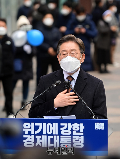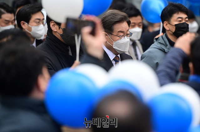 제20대 대통령 공식 선거운동을 하루 앞둔 14일 오전 서울 중구 명동거리를 찾은 이재명 더불어민주당 대선후보가 국민통합 선언식에서 소속당 의원들과 함께 자리하고 있다.