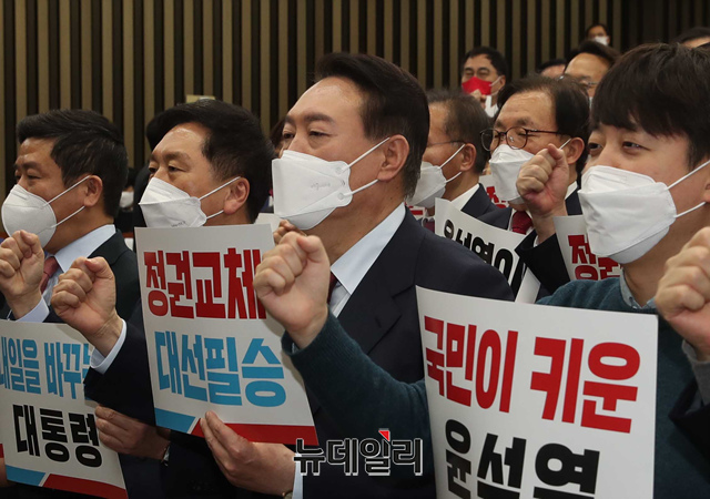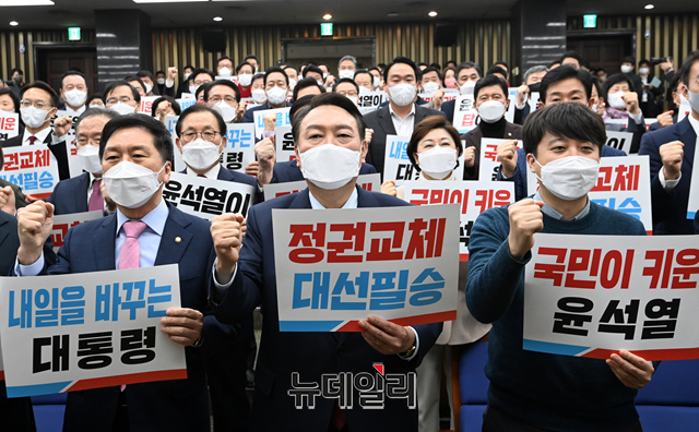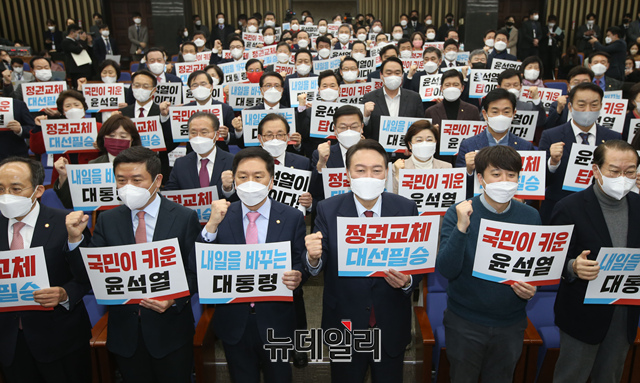 윤석열 국민의힘 대선 후보와 이준석 대표, 김기현 원내대표가 공식 선거운동 하루 전날인 14일 오후 국회에서 열린 의원총회에서 구호를 외치고 있다. (사진=공동취재단)
