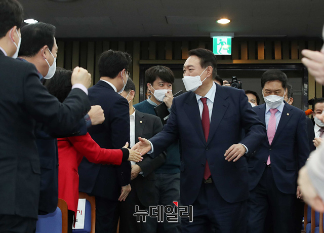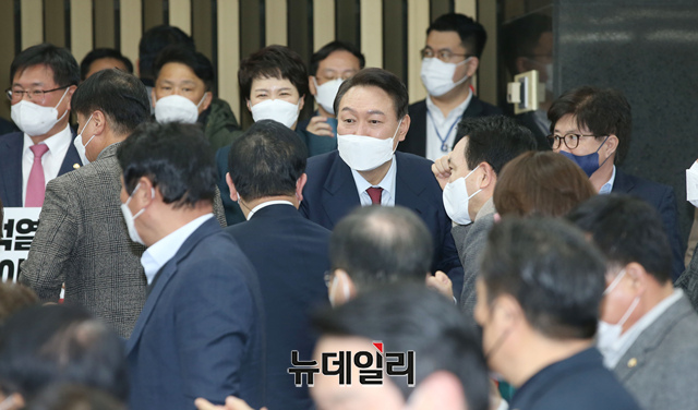 윤석열 국민의힘 대선 후보가 공식 선거운동 하루 전날인 14일 오후 국회에서 열린 의원총회에서 참석하고 있다. (사진=공동취재단)