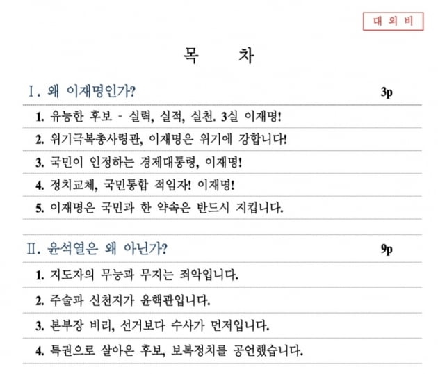 이재명 "일체의 네거티브 중단하겠다" 하더니… 민주당 '대선 유세전략'문서 나와"윤석열 되면 망한다, 주술중독·알콜중독, 구두에 양말 양주" 모독성 내용 담아"이재명은 '유능한 후보'로 지칭… 위기극복 총사령관, 경제대통령 이미지 강화"국민의힘 "여당 선대위 차원 공식 문서에서 네거티브 적극 장려… 부적절" 질타