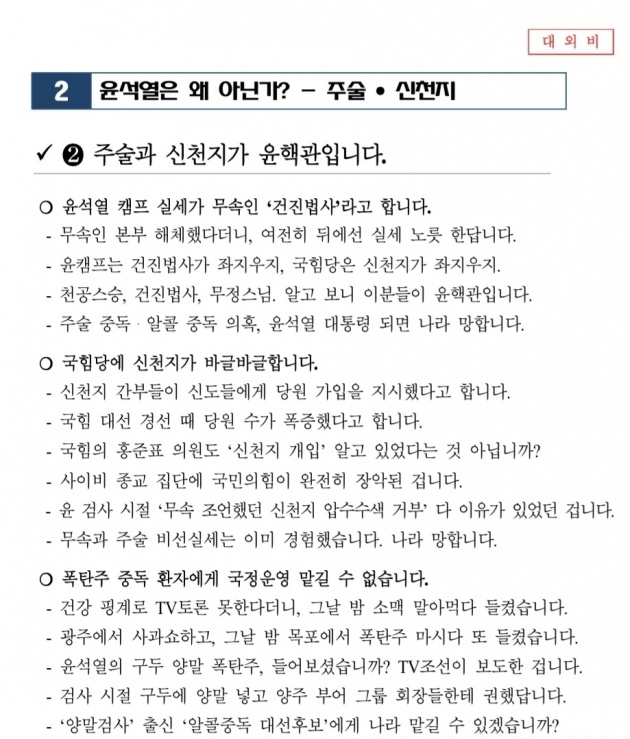 더불어민주당이 선거 유세전략으로 윤석열 국민의힘 대통령후보를 '폭탄주중독 환자'로 표현하며 주술 논란과 신천지 논란 등을 적극 활용하기로 한 것으로 드러났다. 공식 선거 운동 하루 전날 공개된 민주당 선거 전략 문서에서다.15일 민주당 '대선 유세 메세지 기조' 문서에 따르면, 민주당 선대위 전략기획본부는 이재명 자당 대통령후보를 '유능한 후보'로 지칭하고, '위기극복 총사령관' '경제대통령' 등의 이미지 강화를 유세전략으로 꼽았다.'尹 캠프 실세는 건진법사' 등 네거티브성 주장 수두룩반면 윤 후보와 관련해서는 '지도자의 무능과 무지는 죄악' '주술과 신천지가 윤핵관' '특권으로 살아온 후보, 보복정치를 공언했다'는 것 등을 꼽으며 공격 지점을 짚었다.