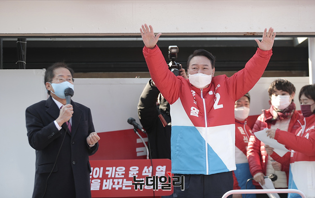 [포토] 윤석열 대구 유세장에 등장한 홍준표