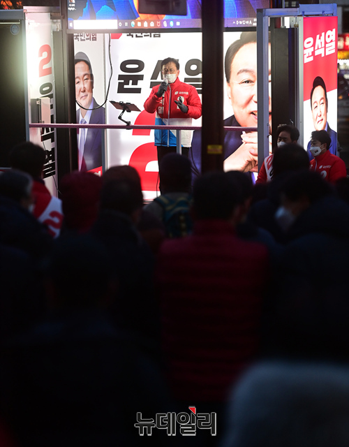 한상학 국민의힘 성북갑 당협위원장이 공식 선거운동이 시작된 15일 오후 서울 성북구 길음역에서 열린 성북갑·을 지역 합동출정식에서 발언하고 있다.