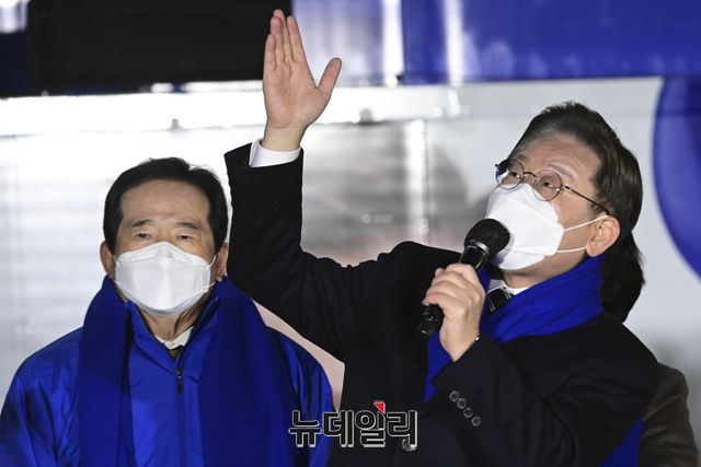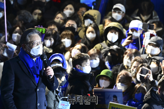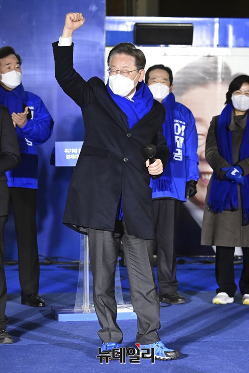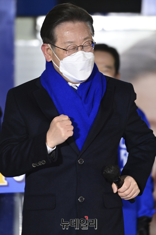 이재명 더불어민주당 대선후보가 선거 유세 첫 날인 15일 오후 서울 서초구 강남고속터미널에서 유권자들에게 지지를 호소하고 있다.