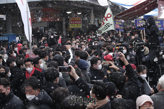 [포토] 광주 송정매일시장서 유세 이어가는 윤석열 대선후보