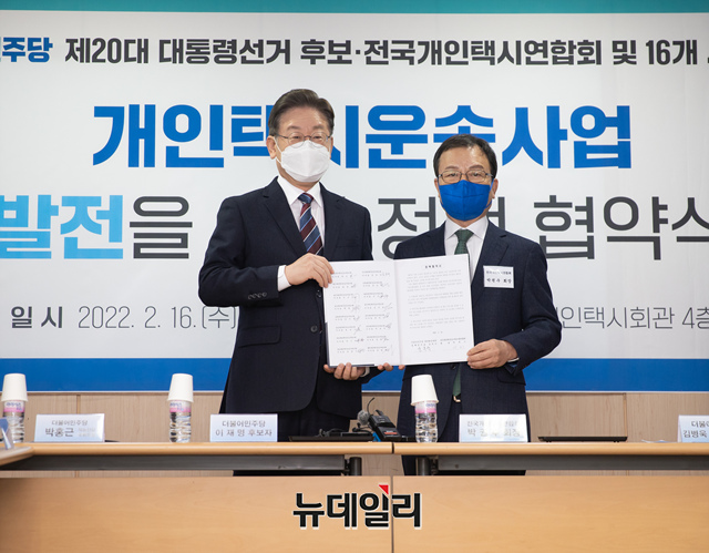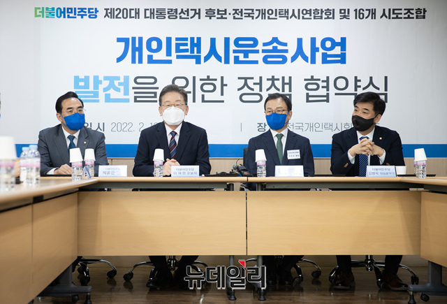 이재명 더불어민주당 대선 후보가 16일 서울 강남구 전국개인택시공제조합에서 개인택시운송사업 발전을 위한 정책 협약식에서 발언을 하고 있다. (사진=이재명 캠프)