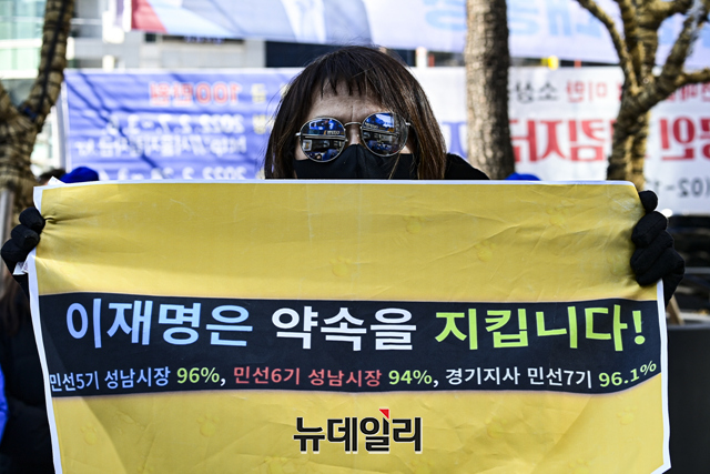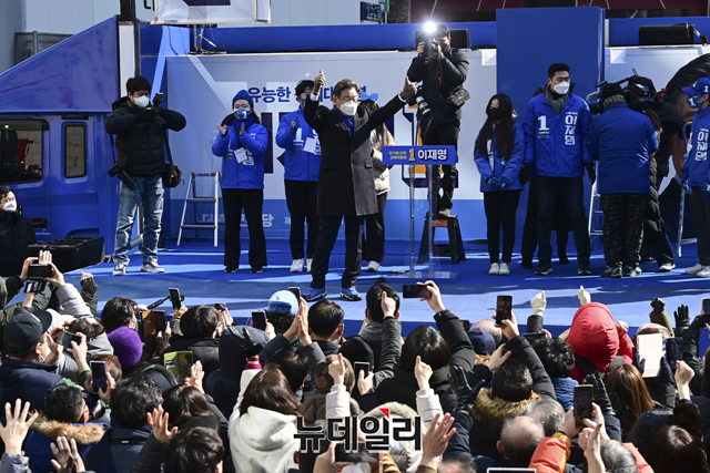 이재명 더불어민주당 대선후보의 선거유세가 이틀 날인 16일 오후 서울 서초구 강남역에서 이 후보의 지지자들이 '나를 위해 이재명!' 등 문구가 적힌 손 팻말을 들고 있다.