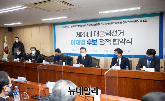이재명 더불어민주당 대선 후보가 16일 오전 서울 강남구 전국개인택시공제조합에서 열린 택시 4단체 정책협약식에서 참석자들과 기념촬영을 하고 있다. (왼쪽부터 강신표 전국택시노동조합연맹 회장, 박권수 전국개인택시연합회 회장, 이 후보, 박복규 전국법인택시연합회 회장, 구수영 전국민주택시노동조합 위원장) (사진=이재명 캠프)