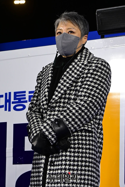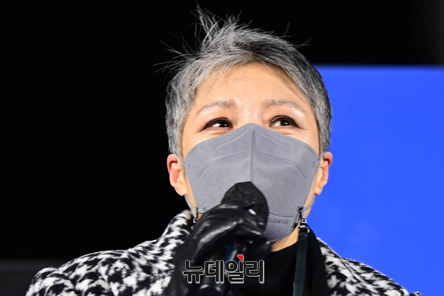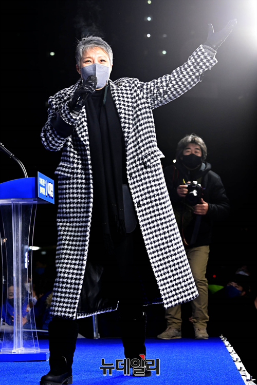 가수 이은미가 16일 오후 서울 송파구 잠실새내역 인근에서 열린 이재명 더불어민주당 대선후보 집중유세에 참석해 지지 유세를 하고 있다.