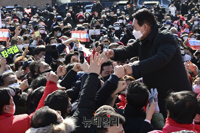 윤석열 국민의힘 대선후보가 17일 오전 경기 용인시 테이스티 애비뉴 주차장 옆 공터에서 유세를 마친 직후 지지자들과 인사를 하고 있다. (경기 용인=강민석 기자)