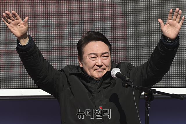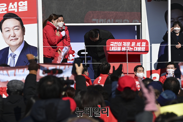 윤석열 국민의힘 대선후보가 17일 오전 경기 용인시 테이스티 애비뉴 주차장 옆 공터에서 유세를 마친 직후 선거차량에서 지지자들로부터 응원을 받으며 인사를 하고 있다. (경기 용인=강민석 기자)