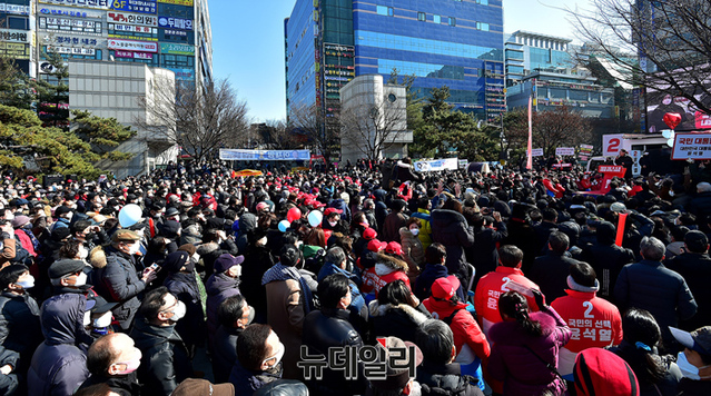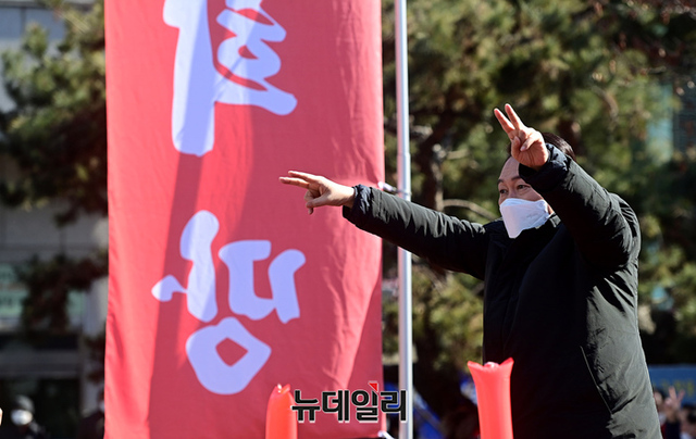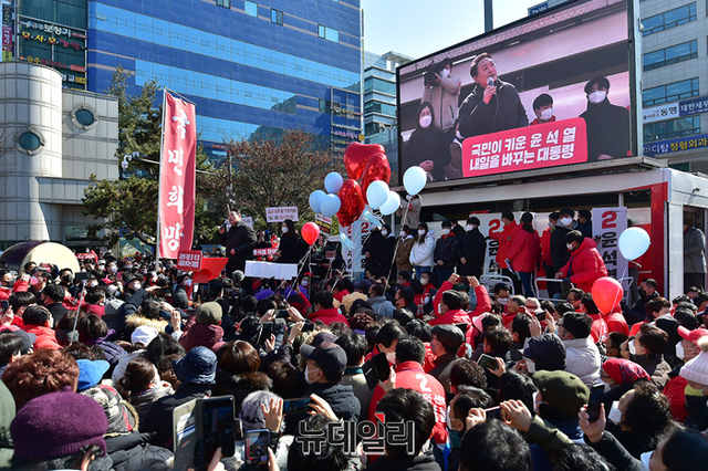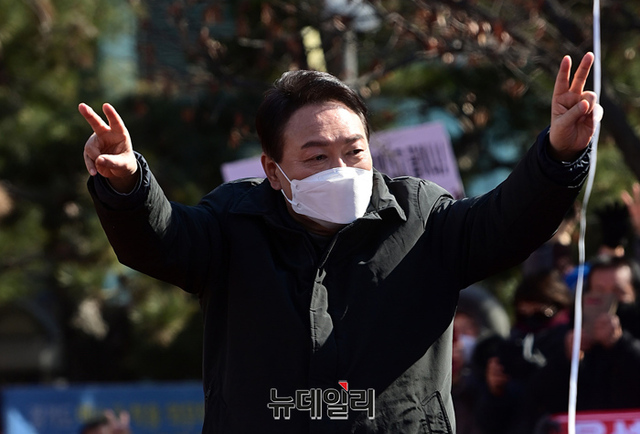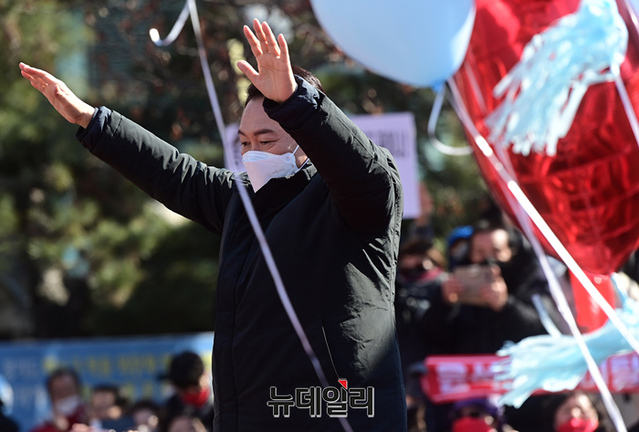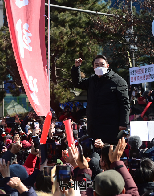 윤석열 국민의힘 대선후보가 17일 오후 경기 성남시 야탑역 광장에서 열린 집중유세 연단에 올라 지지자들에게 손을 들어 화답하고 있다. (경기 성남=정상윤 기자)