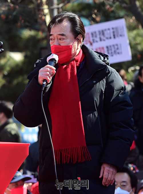 배우 임혁이 17일 오후 경기 성남시 야탑역 광장에서 열린 윤석열 국민의힘 대선후보의 유세장을 찾아 윤 후보의 지지를 호소하고 있다. (경기 성남=정상윤 기자)