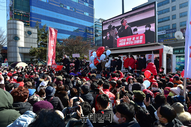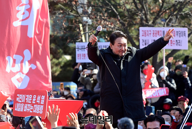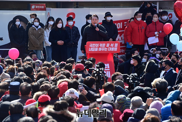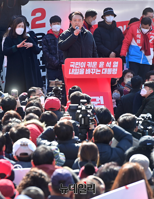 윤석열 국민의힘 대선후보가 17일 오후 경기 성남시 야탑역 광장에서 열린 집중유세 연단에 올라 압도적인 지지를 호소하고 있다. (경기 성남=정상윤 기자)