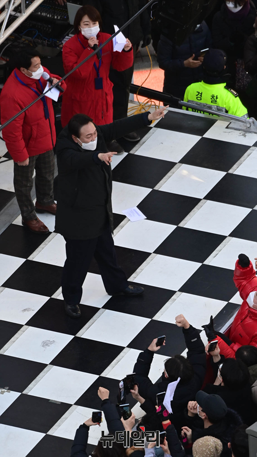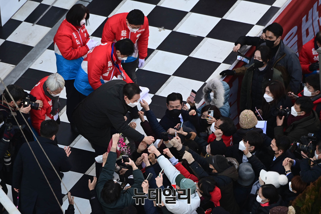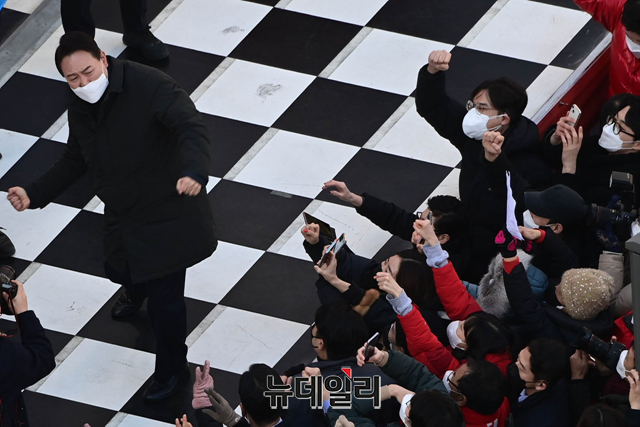 윤석열 국민의힘 대선후보가 17일 오후 서울 송파구 석촌호수 인근에서 유권자들에게 지지를 호소하며 어퍼컷 세리머니를 하고 있다.