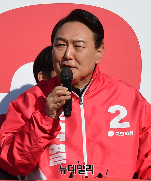 윤석열 국민의힘 대선후보가 17일 오후 서울 서초구 고속터미널 광장에서 열린 선거유세에 참석해 지지를 호소하고 있다.