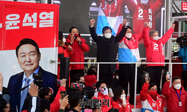 유승민 전 국회의원이 17일 오후 서울 종로구 동묘앞역에서 열린 윤석열 국민의힘 대선후보와 최재형 종로 재보궐선거 후보의 합동 유세장에 등장해 손을 잡고 승리를 다짐하고 있다. 이날 오후 유 전 의원은 윤석열 후보와 만나 조건 없이 정권교체에 힘을 모으기로 했다고 밝혔다.