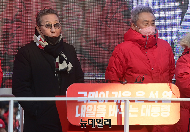 가수 박일남이 17일 오후 서울 종로구 동묘앞역에서 열린 윤석열 국민의힘 대선후보와 최재형 종로 재보궐 선거 후보의 합동유세에 참석해 발언하고 있다.