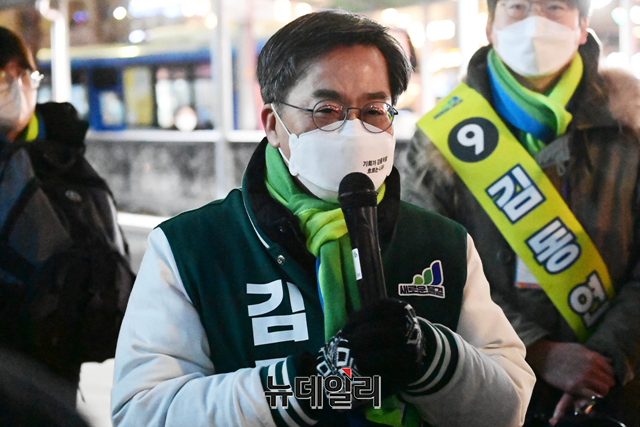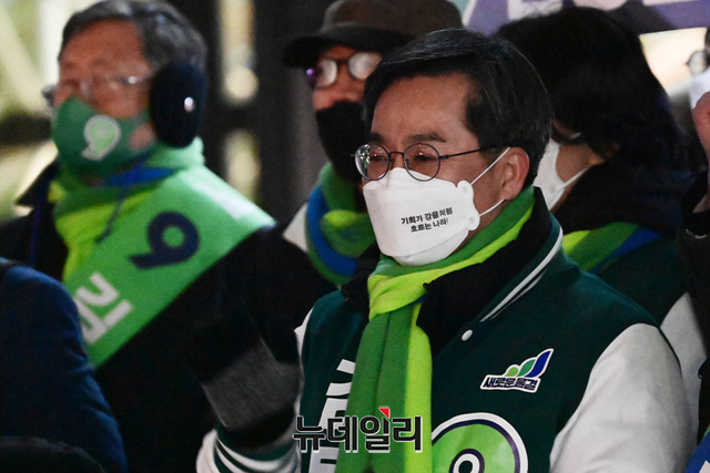 김동연 새로운물결 대선후보와 송문희 종로 재보궐 선거 후보가 17일 밤 서울 종로구 종각역 인근에서 선거 유세활동을 마치고 지지자들과 기념촬영을 하고 있다.