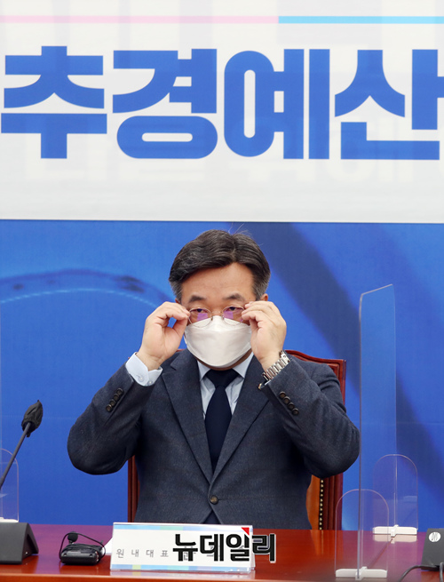 윤호중 더불어민주당 원내대표가 18일 오전 국회에서 열린 긴급 기자간담회에서 추경예산 신속처리 입장을 발표하고 있다. (사진=공동취재단)
